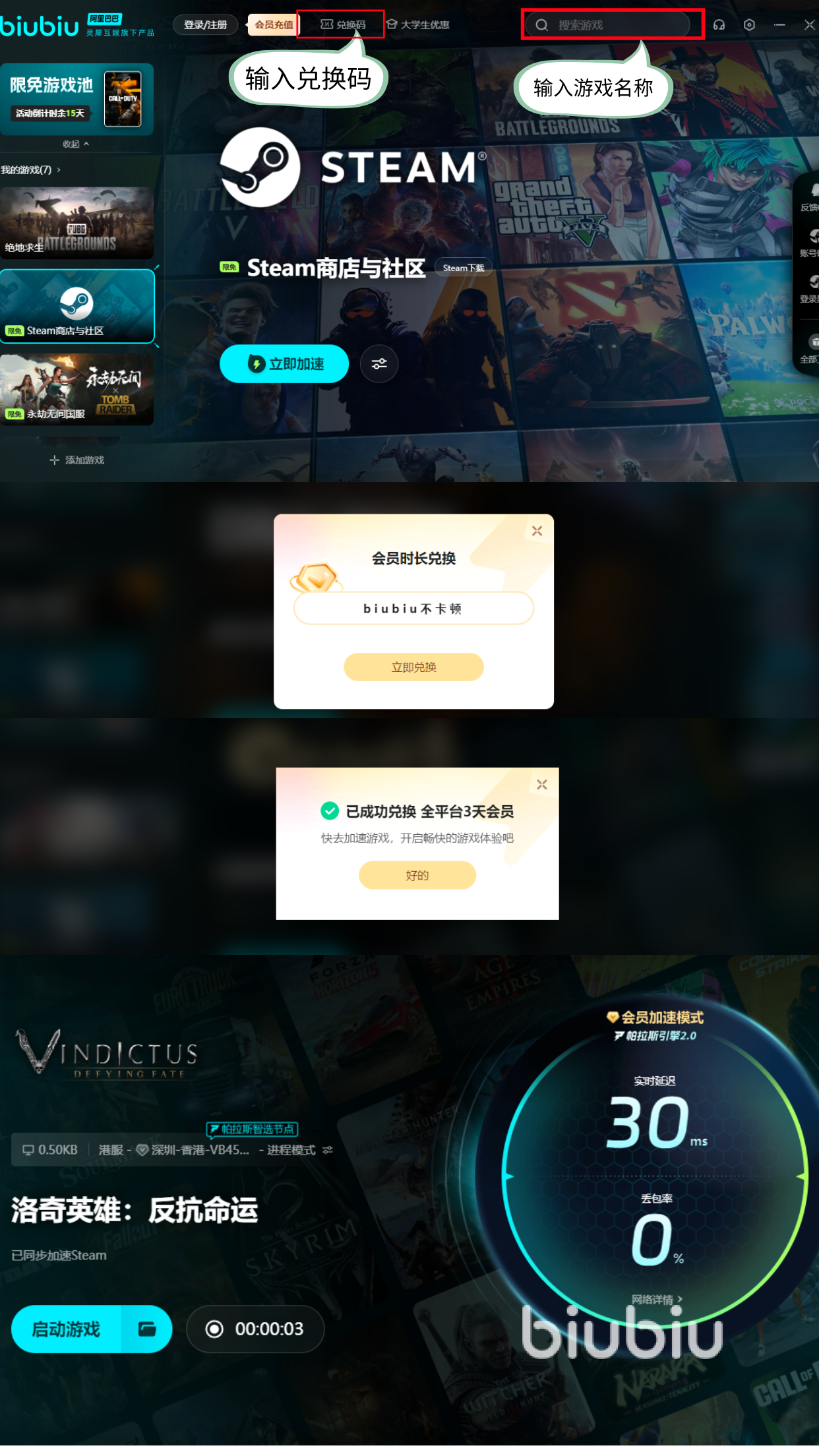 为了在体验过程中能拥有比较高清的画面效果以及流畅的打斗体验,大家可以使用加速器,新用户登录biubiu立刻就可以得到24小时的体验时间,此外,平台的每个用户还可以使用兑换口令【biubiu不卡顿】获取三天的体验时长。