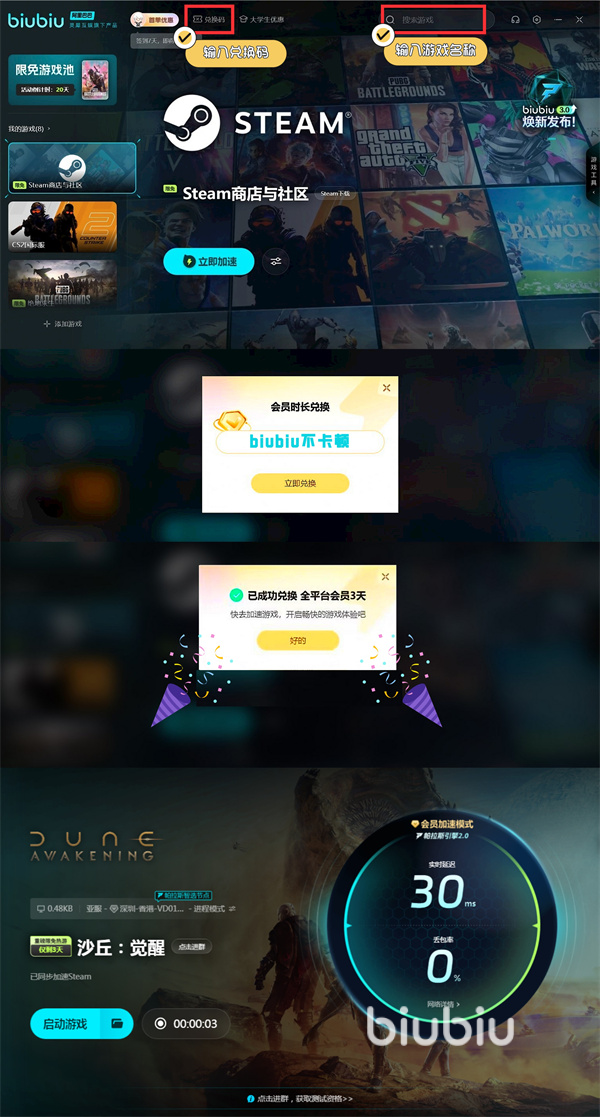 若是到时希望能解锁更多加速的机会,则是主动点击兑换,然后输入【biubiu不卡顿】,这样所有平台小伙伴均能得到72h的加速机会。