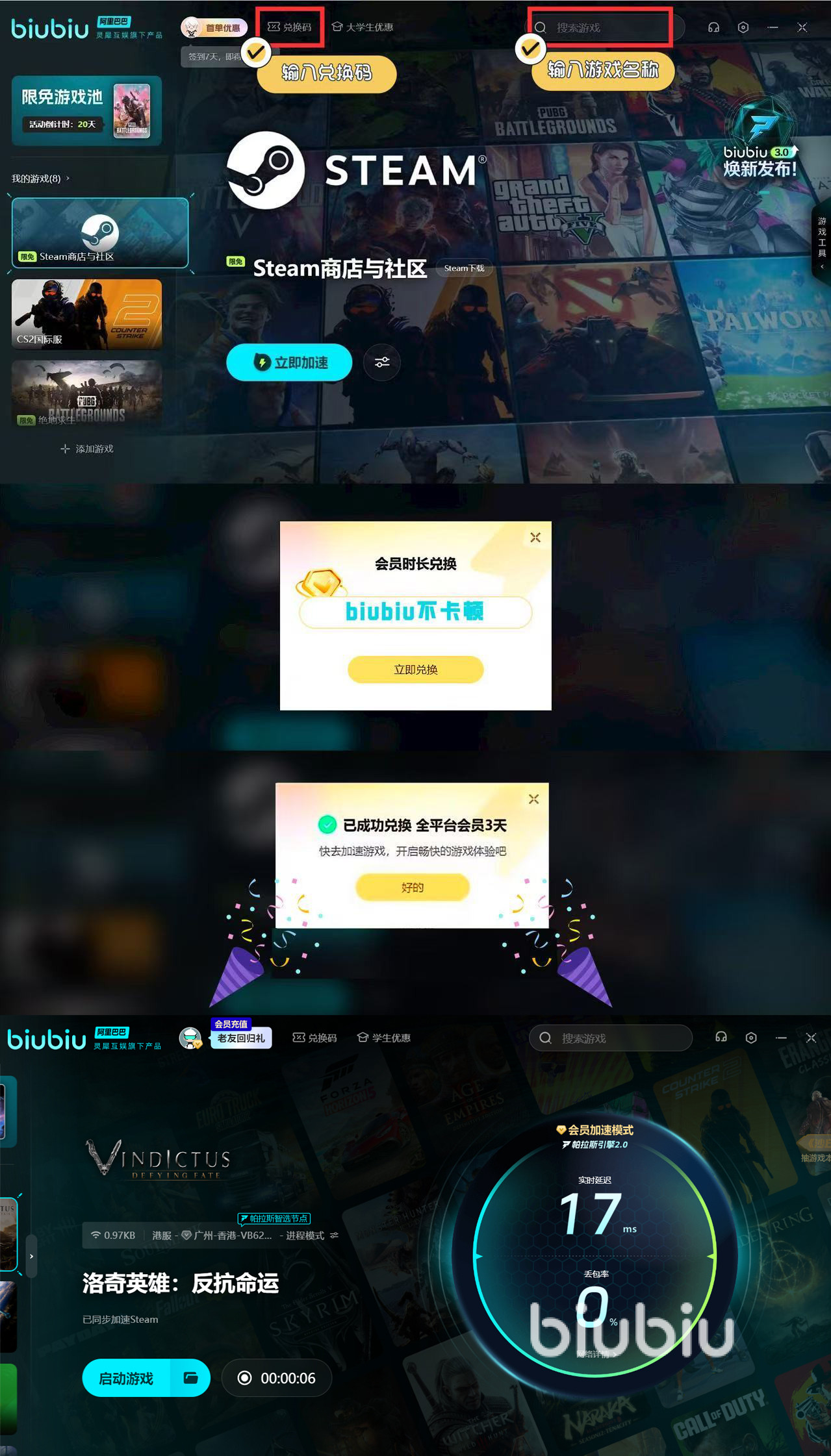 不过要是参数调节好了之后突然闪退,那就无法及时保存。这里建议大家用上biubiu为Steam加速,当网络稳定后,就能避免平台掉线,如此玩时极大概率不会跟着掉线。对于初次注册的新人来说,可享受24小时的免费加速;另外新老用户通过兑换码【biubiu不卡顿】,就能额外获得三天免费加速。