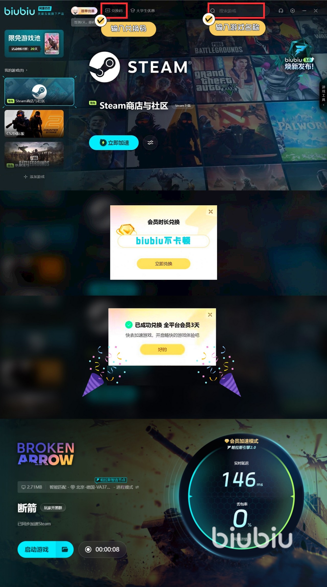 如果小伙伴们需要去解锁更多加速机会,那么点击兑换,利用【biubiu不卡顿】,这样所有平台用户均可顺利领取到72h的加速哦。