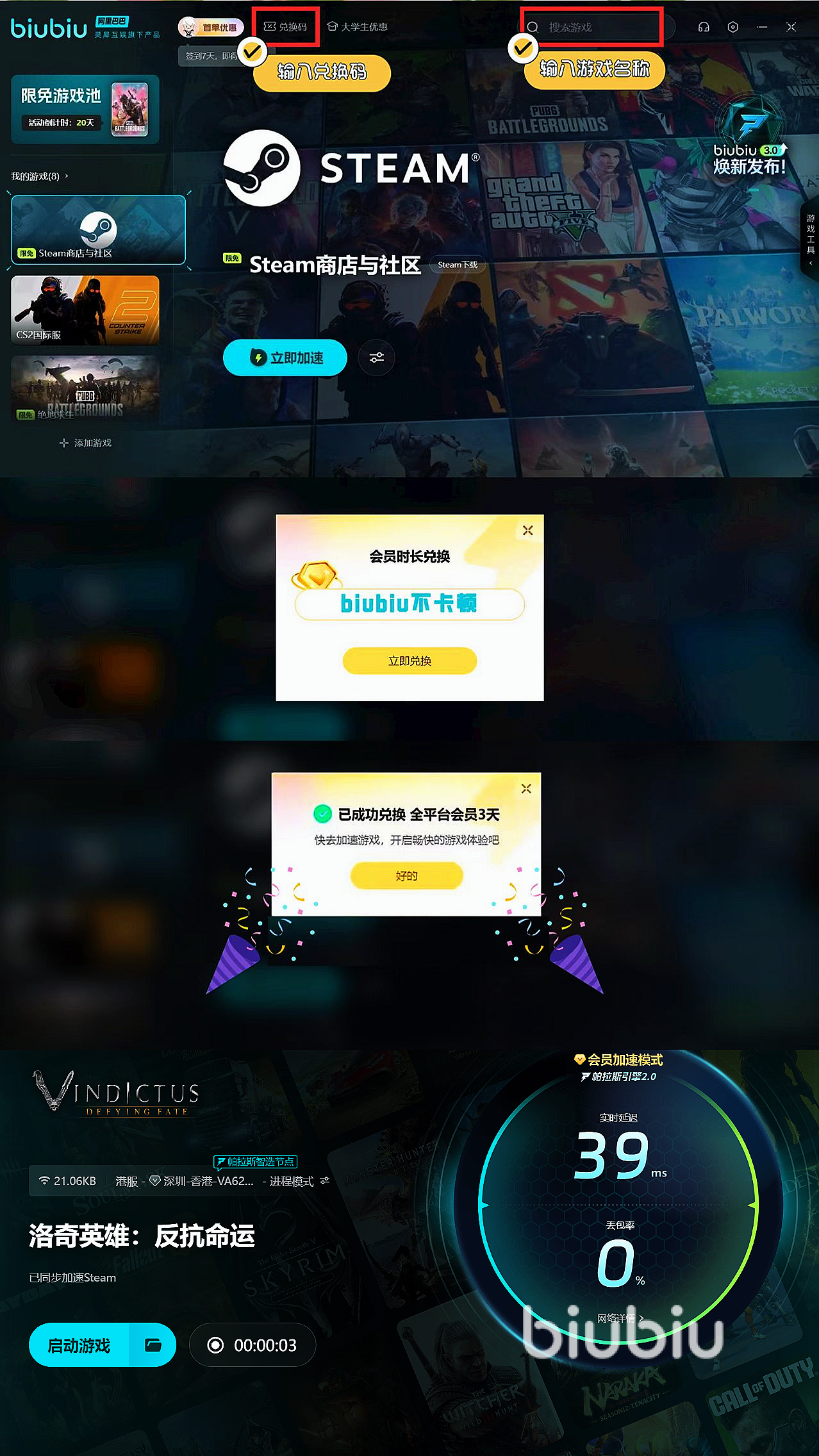洛奇英雄传反抗命运在游玩的过程中会发现一部分的副本难度很高,那么玩家们就需要联机作战,这样可以提高整个团队的容错率,但要是经常掉线的话,还是很容易受到队友的问候,那么就可以使用biubiu加速器来提升游戏的网速,避免掉线的情况,而且新人在注册后便获24小时免费加速,以及新老用户使用兑换码【biubiu不卡顿】可获3天免费的使用权哦。
