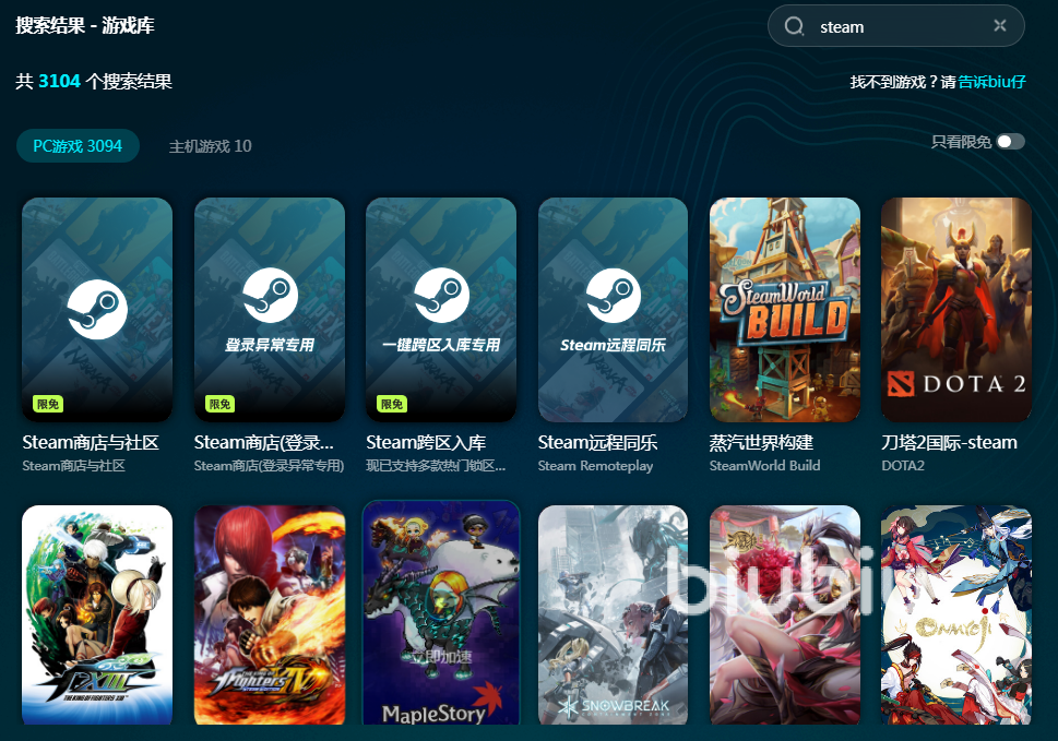 虽然现在拉娜之星2还没发售,但是大家可以先准备好biubiu,用它来玩steam或者是其他的端游游戏也是不错的选择。在biubiu里面搜索steam就能看到大量的加速资源,给其他游戏加速也是形相同的方法。除了主动搜索游戏以外,biubiu也将游戏资源都做好了分类,哪些是热门游戏哪些是最新上线的游戏一目了然。