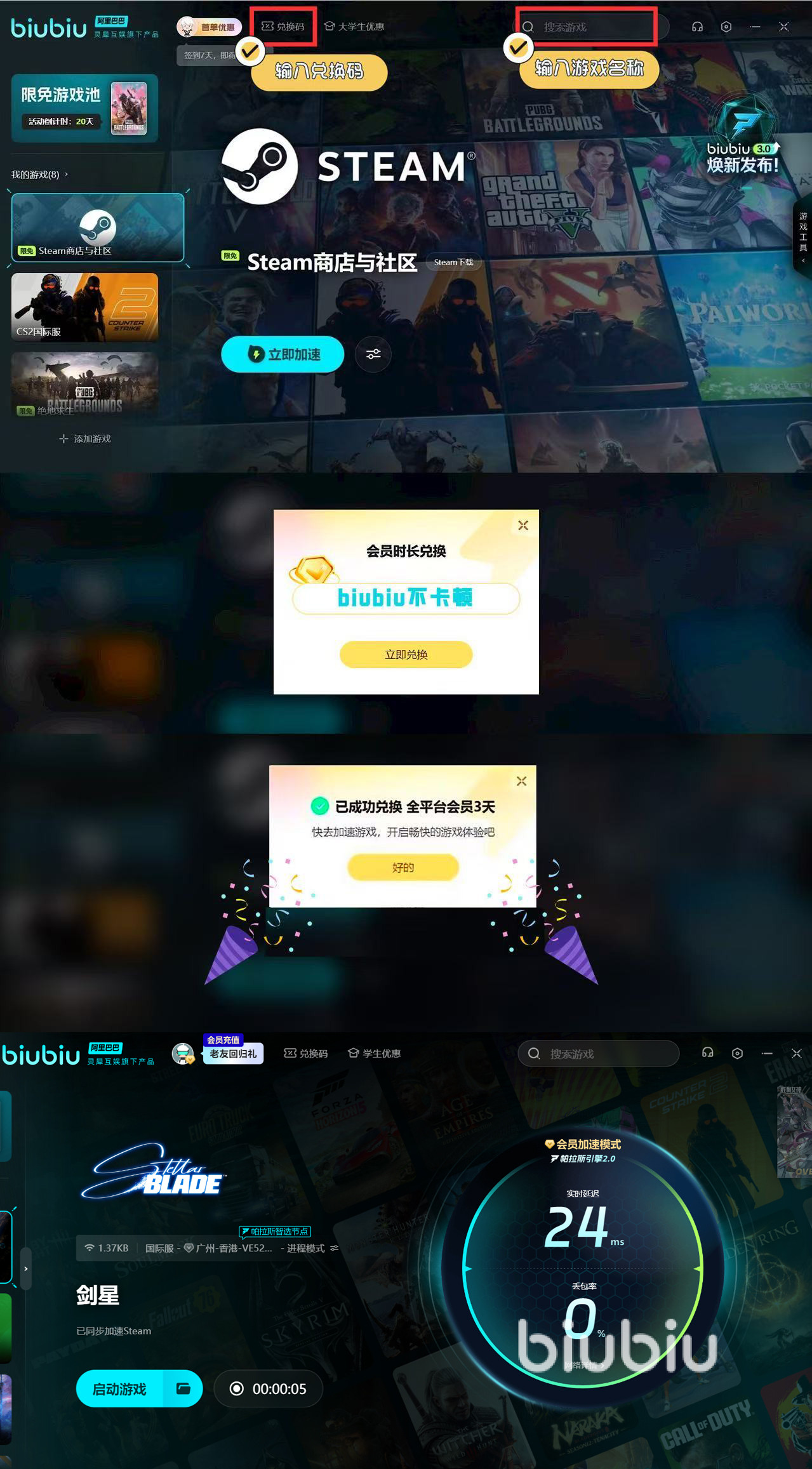 因为搭载了D加密,要是大家网速太卡的话,可能就无法稳定加载游戏了。这时建议各位用上biubiu,有效加速才能继续开始新的冒险并战斗。对于刚注册的新用户来说,可获得24小时的免费加速。另外新老用户通过兑换码【biubiu不卡顿】,就能额外畅享三天免费加速。