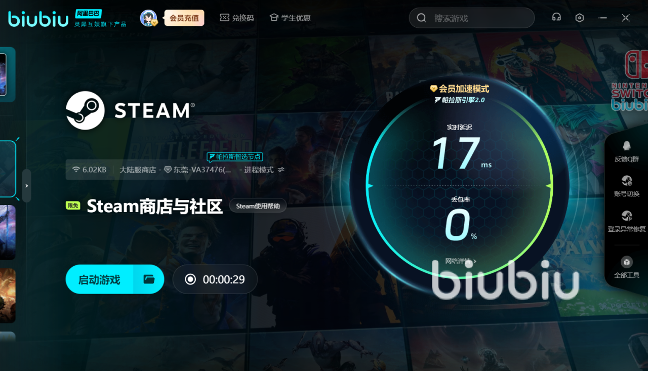 2025年06月11日 17:13 来源:娜迦上火爆猴第一人称射击新作《发条革命》已发布了实机pv,在蒸汽朋克世界里,齿轮城市的精密运转与机械枪战的冒险本应让人沉醉,但发条革命黑屏闪退卡顿延迟丢包怎么办?不少玩家在Steam平台打游戏时总遇黑屏闪退,战斗中突然卡顿延迟,甚至因丢包导致角色卡壳,快点击下面按钮用biubiu加速器优化网络吧。