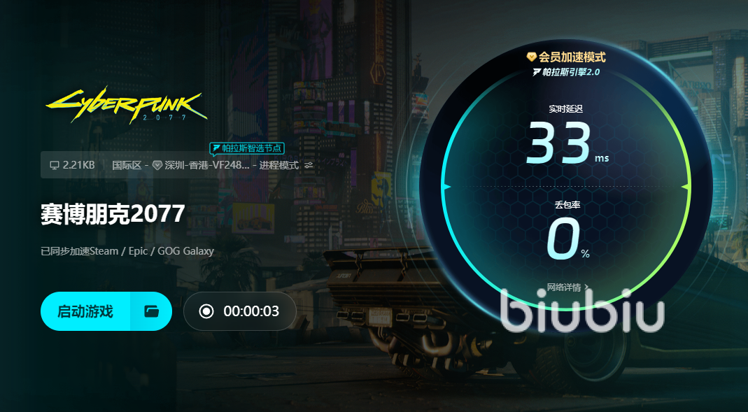 在此背景下,biubiu加速器凭借其专业的游戏网络优化技术,成为解决《赛博朋克2077》读档闪退问题的有效工具。biubiu采用智能动态路由系统,能够实时检测用户的网络状态,并自动连接最优加速节点,确保游戏在与服务器进行同步时的网络通畅度。通过这种方式,可以有效避免由于网络超时或连接中断所导致的闪退、加载失败等情况。同时,对于通过游戏平台云端存储和读取存档的玩家来说,biubiu还能在同步云数据时减少丢包率,提高整体加载成功率,显著降低读档失败的几率。