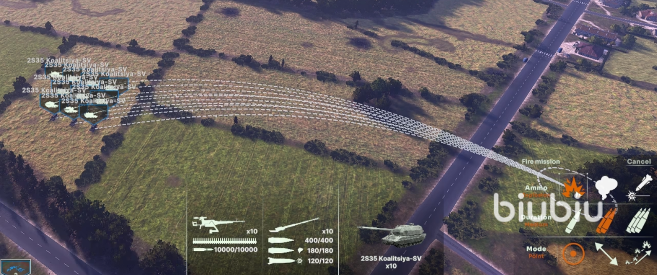 用2S35为例,选取之后打开右下方的攻击图标,可以进入二级攻击面板,第一个就是高爆弹,可以打敌方补兵以及一些轻装甲目标,第二个为烟雾弹,遮蔽敌方视野从而掩护友军进攻或者撤退,第三个是激光指引炮弹,精度很高,但是需要友方单位配合,比如侦察兵的激光引导。