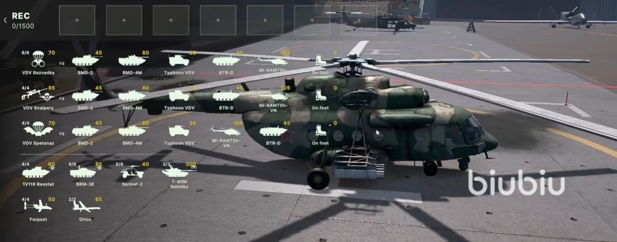 直升机:包含运输直升机以及武装直升机,主要做的事情为快速向前线输送兵员以及补给物资,还承担快速支援我方地面单位的职责。