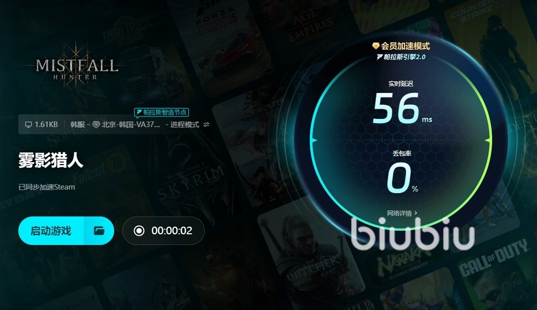 biubiu加速界面还会为我们展示当前的加速状态,数据都是公开透明的,像延迟丢包数据玩家们都能一键掌握,能够为我们提供一个良好的游戏体验空间,还拥有海量的节点,如果觉得当前节点过于拥挤,直接手动切换就可以了。后期不想用了,直接关闭即可,除了雾影猎人之外,biubiu还涵盖了上万款不同类型的海量大型游戏,只需要下载一个平台就能进行一键畅玩,还有很多steam游戏都是可以一键入库的,这对于喜欢玩游戏的小伙伴来说简直不要太给力。