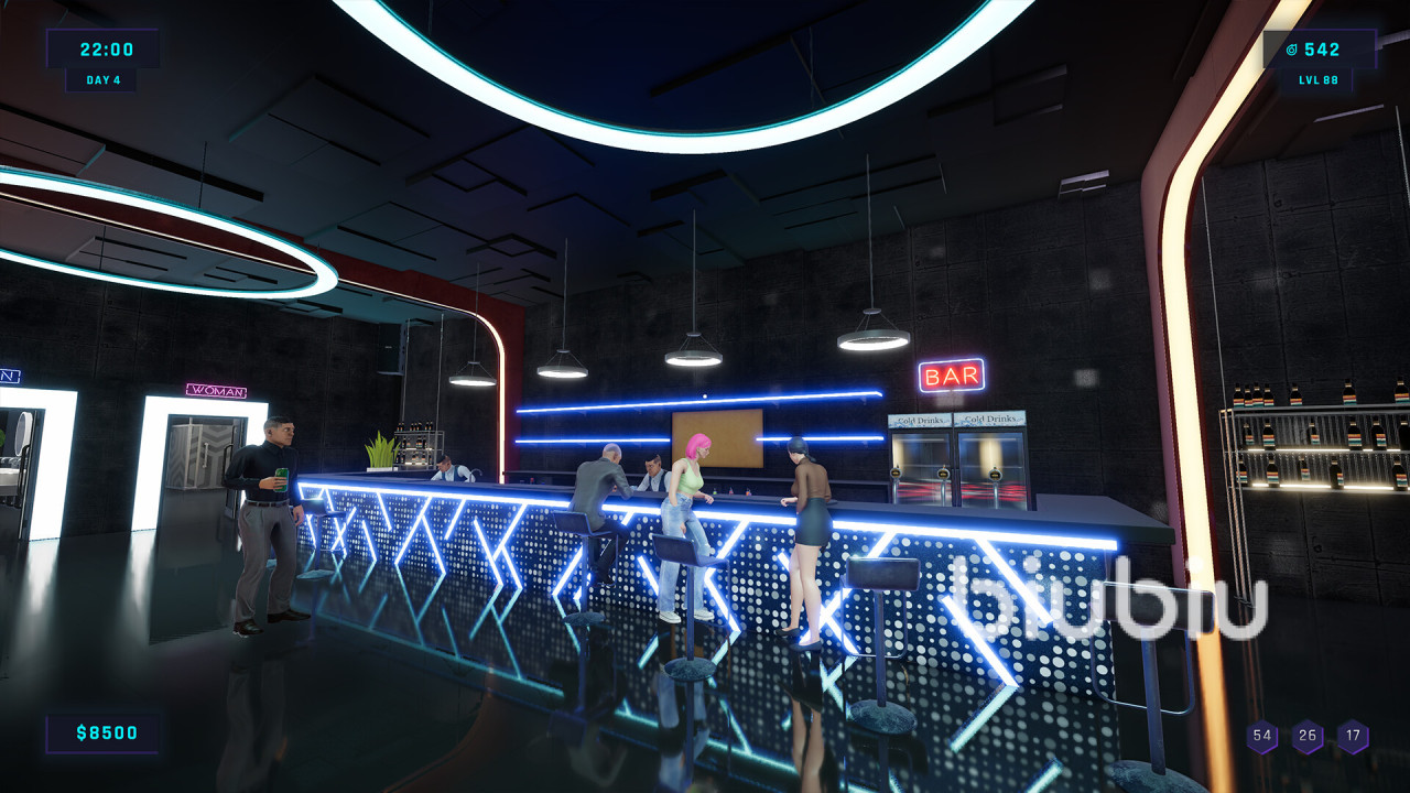 丰富的装修与设施系统。提供大量装修选项和设施,玩家能根据喜好和经营需求打造独特风格,无论是赛博霓虹风还是复古Disco风都可实现,从灯光布置到桌椅摆放,都能亲自设计。