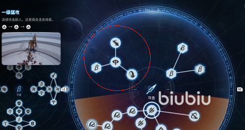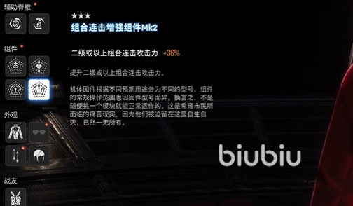 游戏的普攻分为轻攻击,重攻击,和通过使用重攻击按键的前冲攻击,分别对应了技能树下方左侧,中间和右侧,这里大家要注意的是有的装备加的是特定阶段的连招伤害,比如组合连接增强组件mk2,2级或以上组合连击才可以得到的36%攻击力加成。所以在装配装备的时候,大家要注意一下自己当前是否能够使用,以及什么技能可以得到加成。