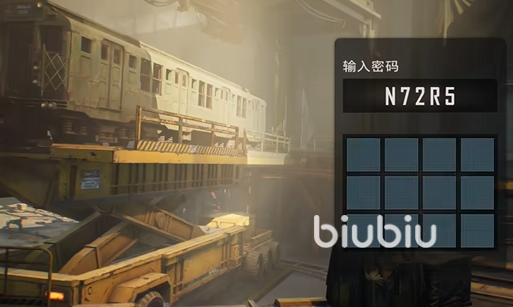 清洗完列车之后,小伙伴们从列车旁走,去到对面,然后左转下楼梯,来到大门前,可以看到一个密码装置,接近交互之后只需要输入N72R5就可以打开大门了。