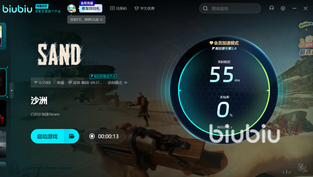 沙洲目前来说就是一款国际大作,所以人就暂时没有上线国服。想要进入海外沙漠的玩家建议用上biubiu,加速后才能够获取自己的战舰。如果是刚注册的新人,就能立刻获得24小时的免费加速。另外新老用户通过兑换码【biubiu不卡顿】,即可额外获得三天免费加速。在沙漠中寻找资源时太卡的话,就会被周围的中立野怪所击杀。这里推荐用上加速器,才可在沙漠中快速搜寻足够多的资源。