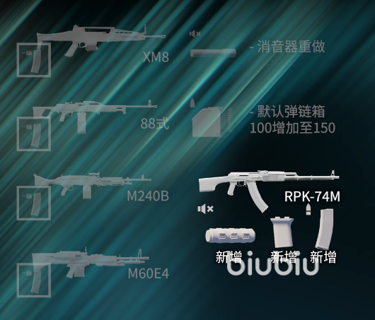 轻机枪同样获得多项调整。XM8、Type 88八八式、M240B和M60E4都新增了减装弹匣配件。XM8的消音器效果被重做,性能发生改变。八八式轻机枪的默认弹容量从100发提升至150发,显著增强其持续火力能力。RPK-74M则新增了包裹式消音器枪口、BCG轻型握把以及高威力弹鼓弹匣配件。精确射手步枪和狙击枪方面,M39 EMR、SVD、GOL玛格南均新增了BCG轻型握把和减装弹匣。GOL玛格南额外增加了眼镜蛇握把和LS-1激光瞄准器下挂配件,并新增了穿甲弹药与高威力弹药选项,同时修复了其移动时精度异常的BUG。冲锋枪与手枪中,P90和M93R新增减装弹匣,PP-2000和MP412 Rex则新增了LS-1激光瞄准器下挂配件。
