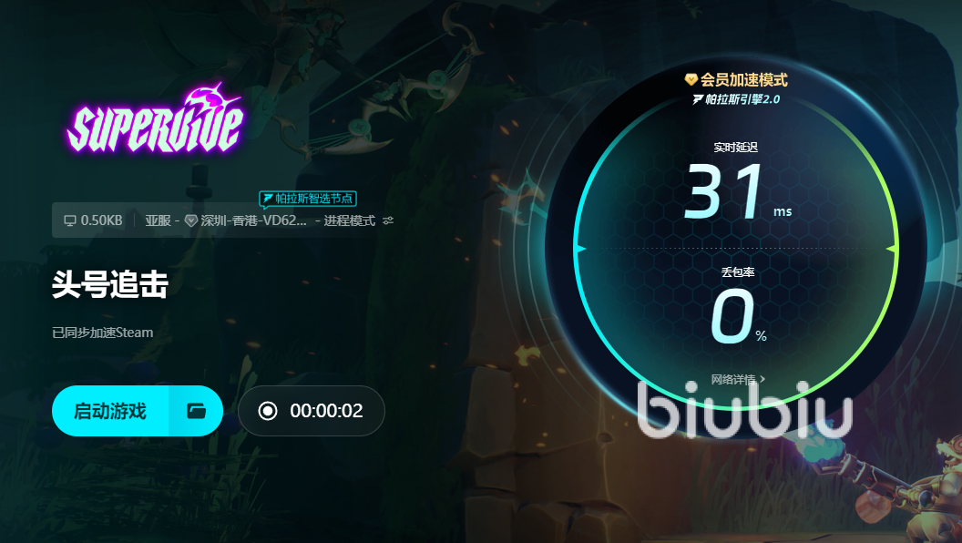 biubiu加速器的主要方法就是使用独特的智能分配技术,结合自身为游戏准备的大量加速节点,智能地为玩家合理分配节点,最后建立一个稳定、快速、持久的网络环境,帮助玩家玩SUPERVIVE的时候能快速传递数据,避免数据丢包、延迟传输的问题。