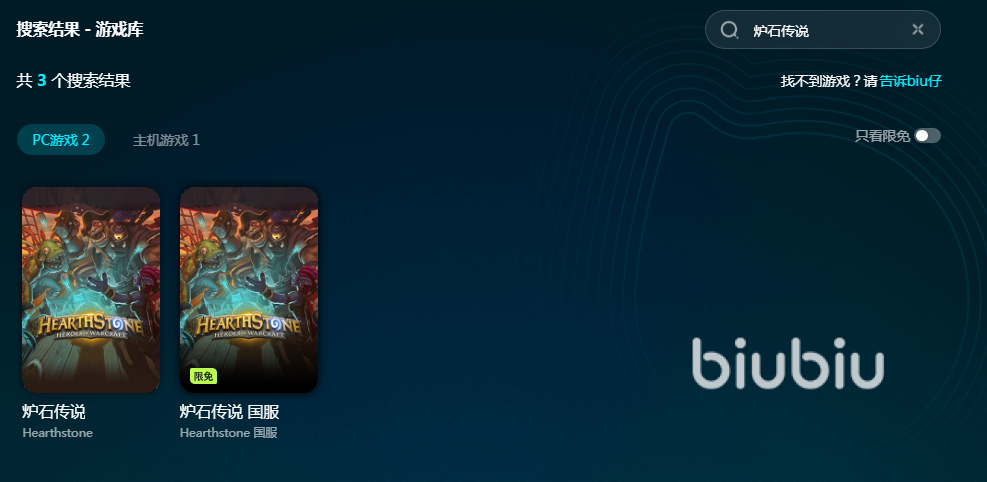 无论你玩的是PC端的炉石传说还是主机端的炉石传说,都能用biubiu,它收录的资源很齐全,除了炉石传说以外还能在软件里找到上万款游戏加速资源,想玩什么应有尽有,国服和海外服统统在其加速范围内。