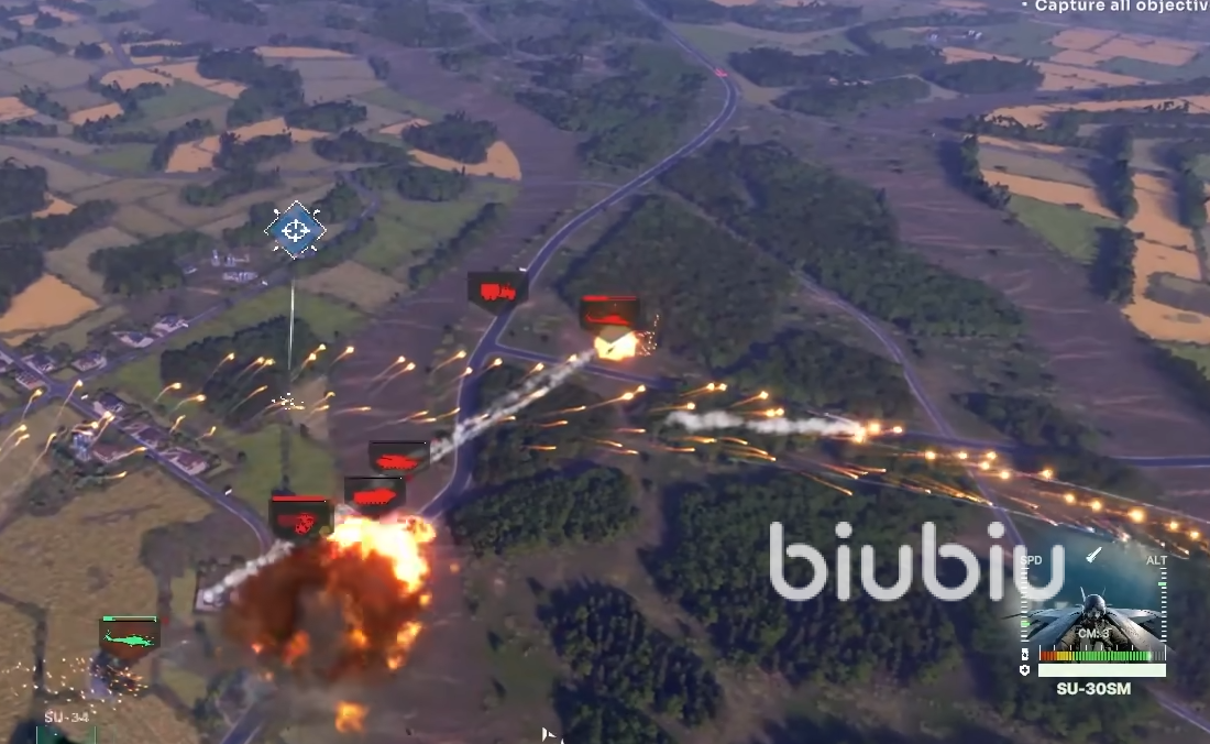 坦克倒车按R键实现后退机动。运输机投送需先按O键规划降落航线,避开前线高危区域后投放部队或补给箱。战斗机操作面板提供导弹开关、机炮切换功能:C键释放箔条/热诱弹,V键调整飞行高度,B键命令返航。加力燃烧室(Afterburner)可短暂提升飞机速度,用于紧急脱离或超音速突防。轰炸任务需选中攻击机(如30SM)后绘制轰炸路径线,勾选"Study Run"选项使飞机自动脱离战场。
