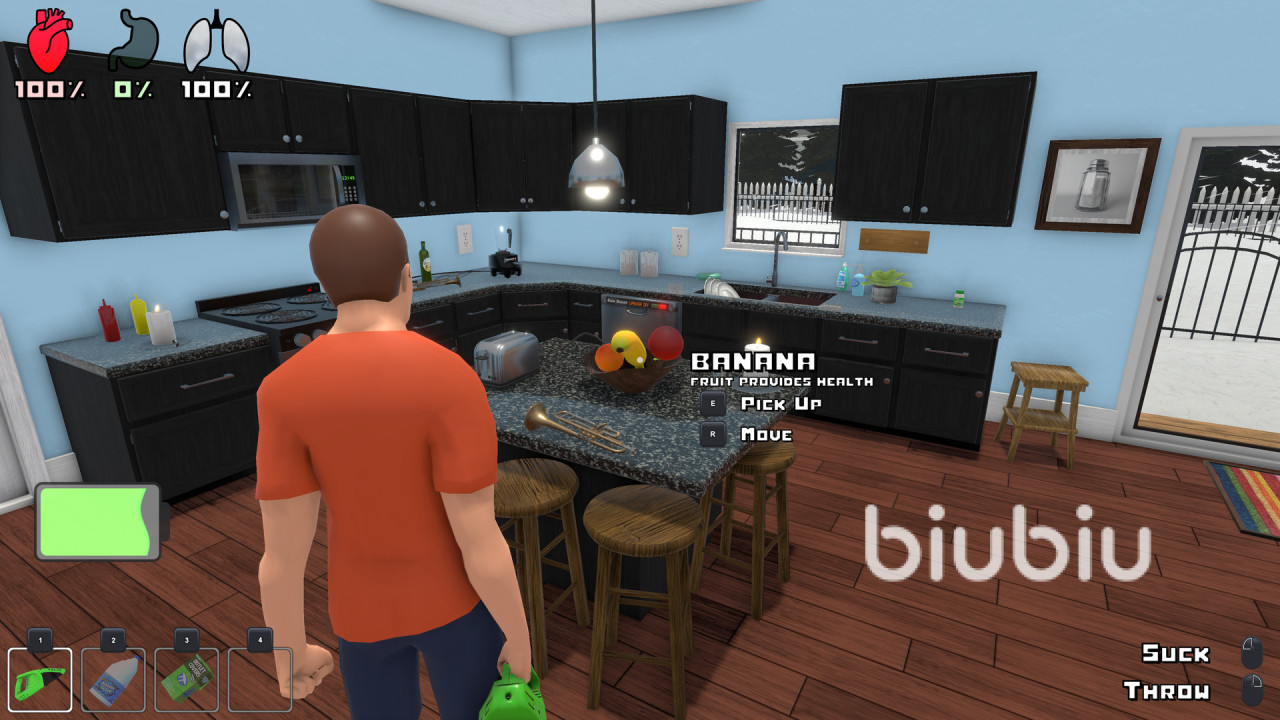 丰富的场景与道具交互,场景多样,游戏场景设定在一个两层楼的房子和花园中,包括客厅、厨房、卧室等多个房间,每个房间都有大量可交互的道具和物品。
