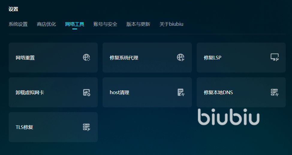 如果加速功能还不能解决大家的问题,那么就来工具箱进一步修复一下网络吧,这个工具箱里有7种工具可以修复网络,不管是重置网络还是卸载网卡都可以,小伙伴们网页无法加载、游戏加速失败,这些问题再也不用到处求人帮忙解决了,只用一个biubiu就能搞定。