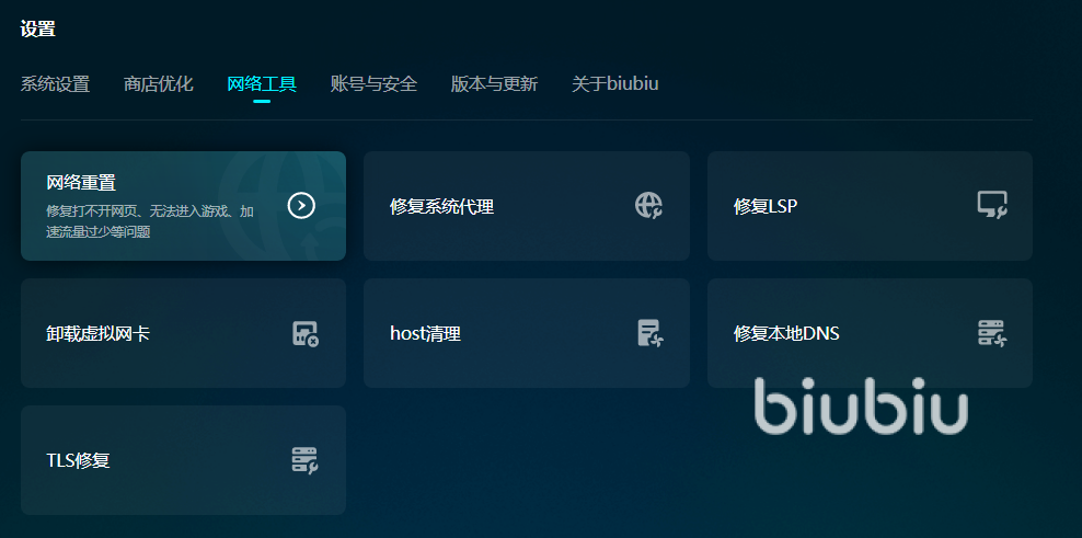 biubiu还准备了实用工具箱协助用户优化改善电脑环境,想要清理缓存或者是想要重置DNS都可以。很多玩家只顾着玩游戏,对于电脑网卡修复一窍不通,遇到问题以后也找不到人来帮忙看看,现在有了biubiu大家不用四处求人了,基础的网络故障都可以用它来修复。