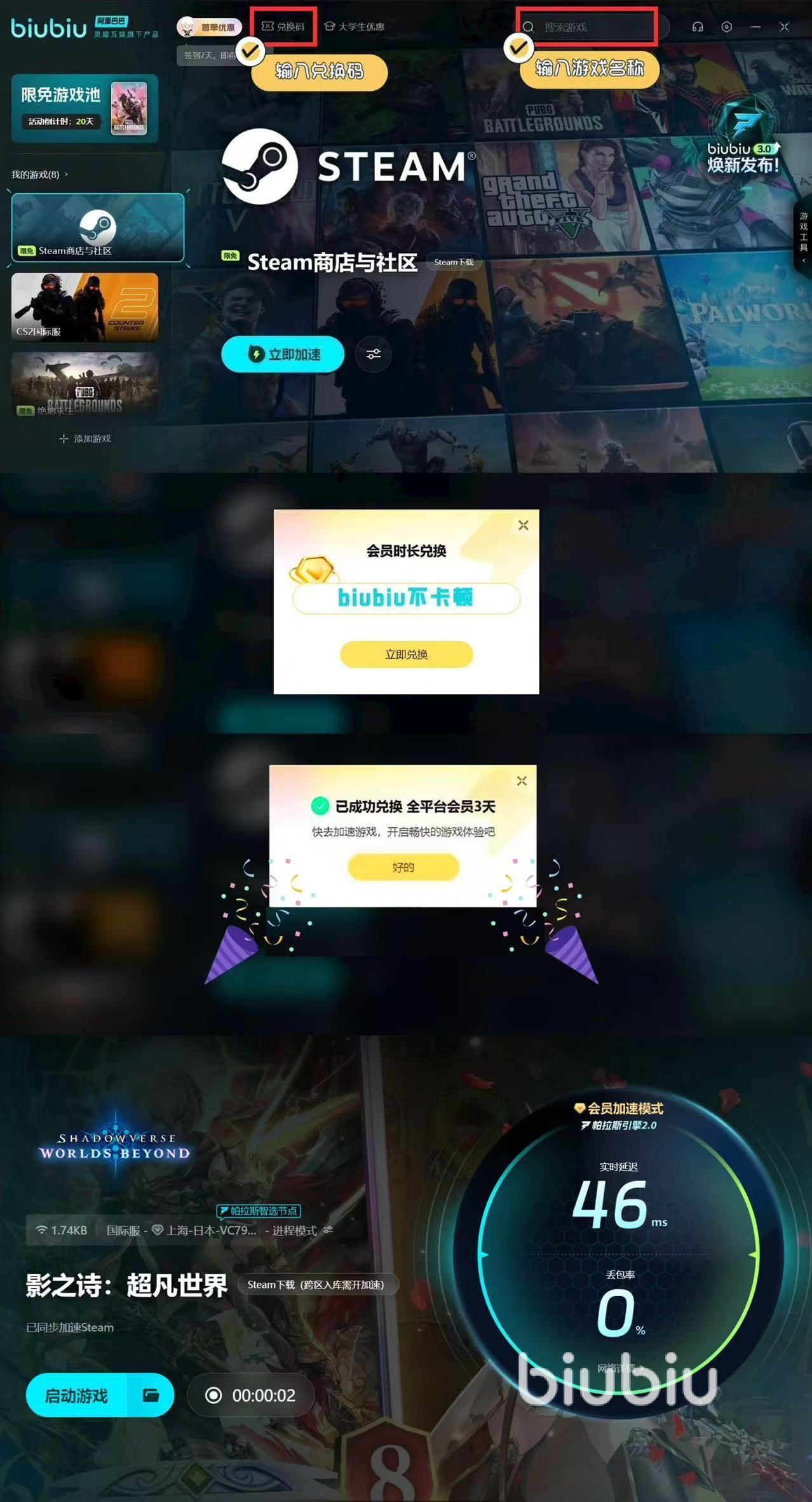 若是各位希望能解锁更多加速时长,那么只需点击界面内的兑换,然后输入【biubiu不卡顿】,如此所有平台用户都能成功领取到72h的加速时长,让自己长时间游戏,也不用在担心会遇到掉帧等影响,新用户福利叠加还能解锁96H的加速哦。