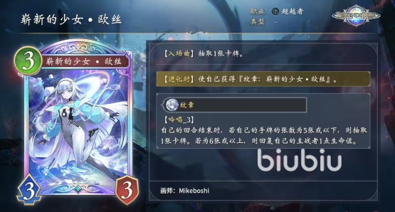 崭新的少女欧斯也是非常实用的一张卡牌,在自己回合结束时,当自己手牌数量为5张以下时,能够抽取一张卡牌,若是6张以上,则能恢复主战者一点生命,非常实用。