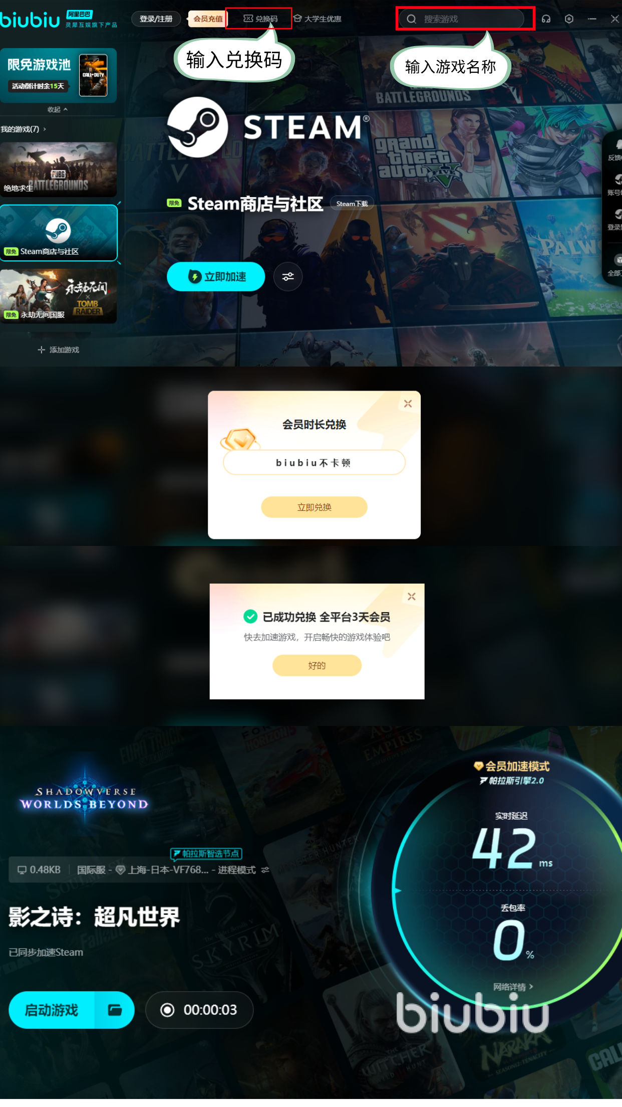 若是玩的时候要用到加速器,大家可以试试上方分享的这款,不仅简单好用,还拥有着超多福利,让小伙伴们可以无偿尝试。新用户登录注册直接就有24小时无偿加速时间享受,此外还可以额外领取3天免费加速时间,只需要输入【biubiu不卡顿】进行领取,每个小伙伴都可兑换一次。