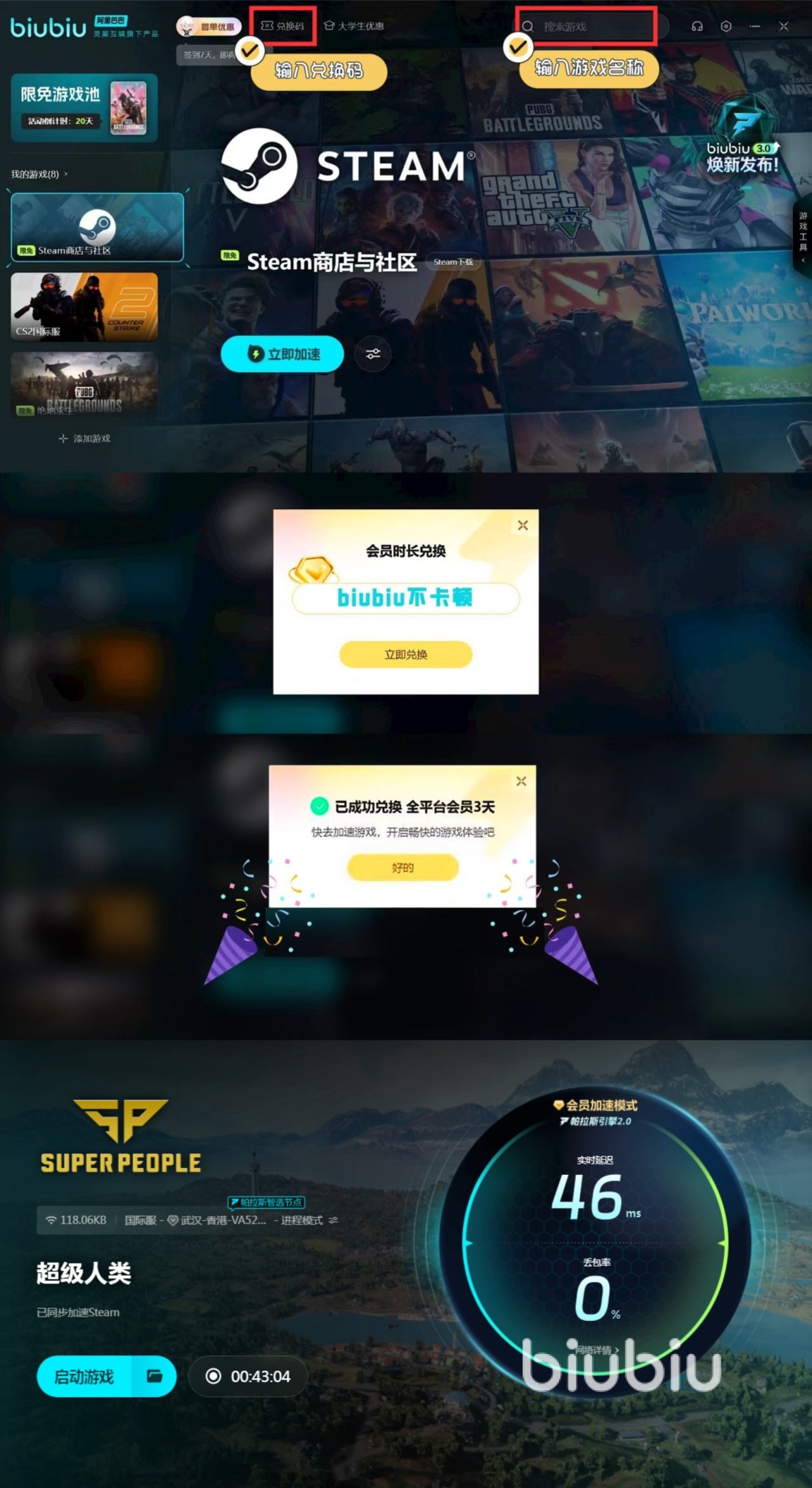 因为这款游戏目前还处于测试状态,所以无论是游戏优化还是服务器都有着提升的空间,所以目前容易出现一些闪退卡顿这样的问题。为了能够让大家的游戏生活变得更为顺利,小编推荐大家使用biubiu加速器。现在只需要注册一个新的biubiu账号,就能直接领24小时会员时间。还开放了一个兑换码福利,每个biubiu号都可以用一次,兑换码是【biubiu不卡顿】,能兑换得到72小时会员时间。这样在biubiu的优化之下,就可以克服游戏本身和服务器所带来的各种问题。