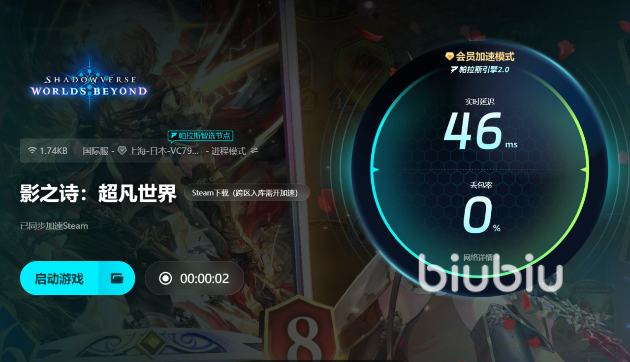 2025年06月19日 11:52 来源:陨石靑沙瓦郎ShadowverseWorldsBeyond延迟丢包怎么处理?许多玩家在体验这款融合卡牌策略与幻想冒险的二次元对战游戏时,常遇网络波动导致延迟和丢包,影响操作流畅与对战节奏。遇到这类网络问题,小编一般都推荐小伙伴们使用biubiu加速器优化自己的网络。毕竟biubiu加速器专为游戏加速设计,能智能优化连接路径,显著降低延迟与丢包率,提升游戏体验和竞技表现,真正实现畅快对战无阻碍。