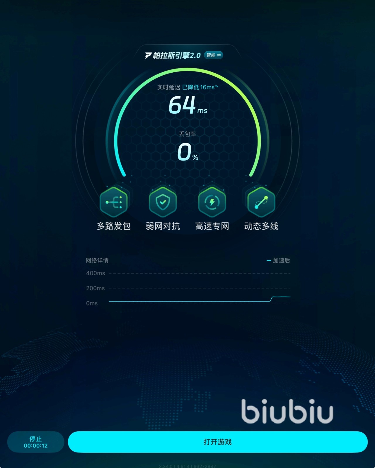 在biubiu手游端上每天观看小视频广告就能领得加速时长,看3个视频兑换24小时了,真正实现“零成本畅玩”。加速界面实时显示的延迟、丢包率等数据,搭配帕拉斯智能模式,WiFi与4G智能双线双通道,AI调度选最优加速线路,让玩家在“跨阵营羁绊团战”中随时掌握网络健康度。