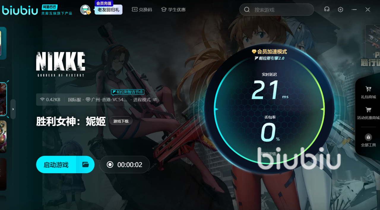 要是大家在参加攻打世界boss时卡顿,那就无法在限定时间内打出更高伤害,从而错失排名奖励。用上biubiu后,自然可获得极速网络,每次都能轻松击败boss。如果大家心血来潮想要去玩一下国际服,本地网络就无法连接。所以一定要用上加速器,这样才能优化网络,让大家来到全新的场景中,体验不一样的妮姬,就好像重新体验新的英雄。