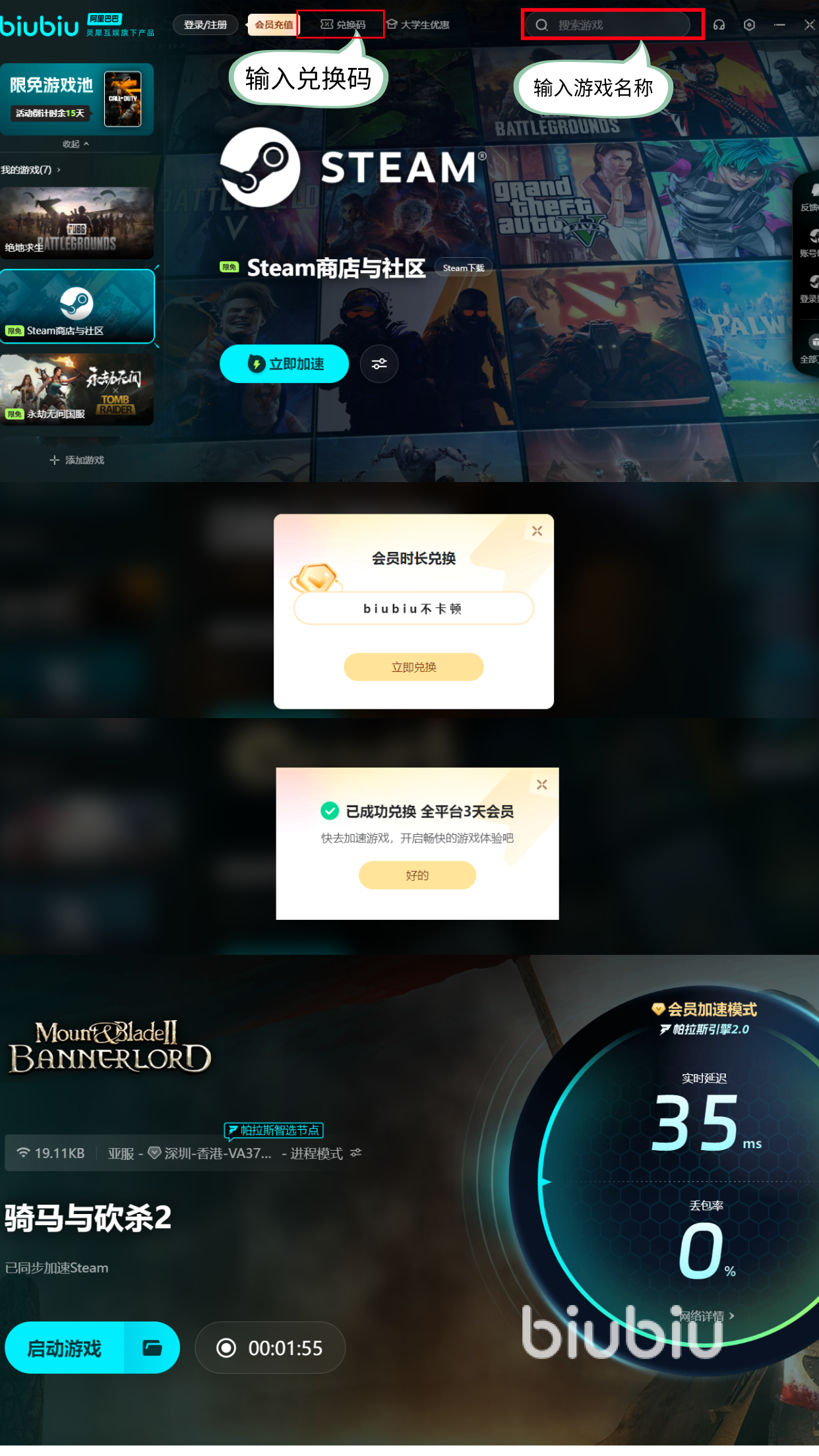 此外,新用户登录注册还可享受超多福利,比如24小时免费加速时长,在大家注册成功时就可以立刻获取,此外,平台还给每个用户提供了三天的免费体验时间,但是需要用户去兑换码区手动输入【biubiu不卡顿】进行领取。