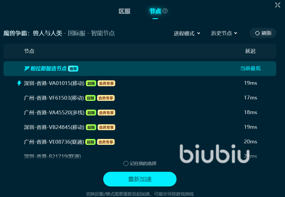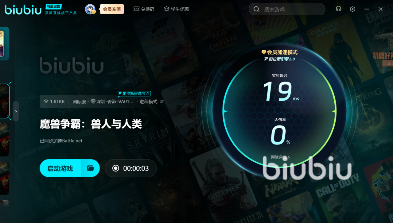 操作也简单,在biubiu加速器首页搜“魔兽争霸”,全系作品(像对战平台、兽人与人类、魔兽3重制版等)一键呈现,点图标就能启动加速,无需繁琐设置。加速后效果立竿见影:新地图加载速度明显变快,实测优化效果显著,就连“纳克萨玛斯”这类多人团战副本,帧率波动也被牢牢控制,对地图卡顿掉帧说拜拜。