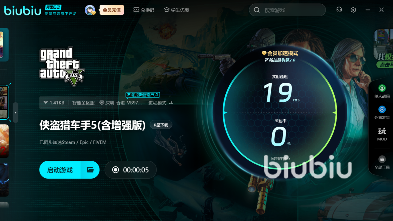 使用biubiu加速更是零门槛,打开软件搜索“GTA5”,一键点击即可完成配置,无需复杂参数调整。加速界面还会实时显示延迟、丢包率等可视化数据,网络状态一目了然;若遇到节点波动,直接在加速详情页就能手动切换更优线路。其智能算法还能根据游戏进程动态优化路径,即便在服务器的高峰期,也能保障你稳定连接线上战局。