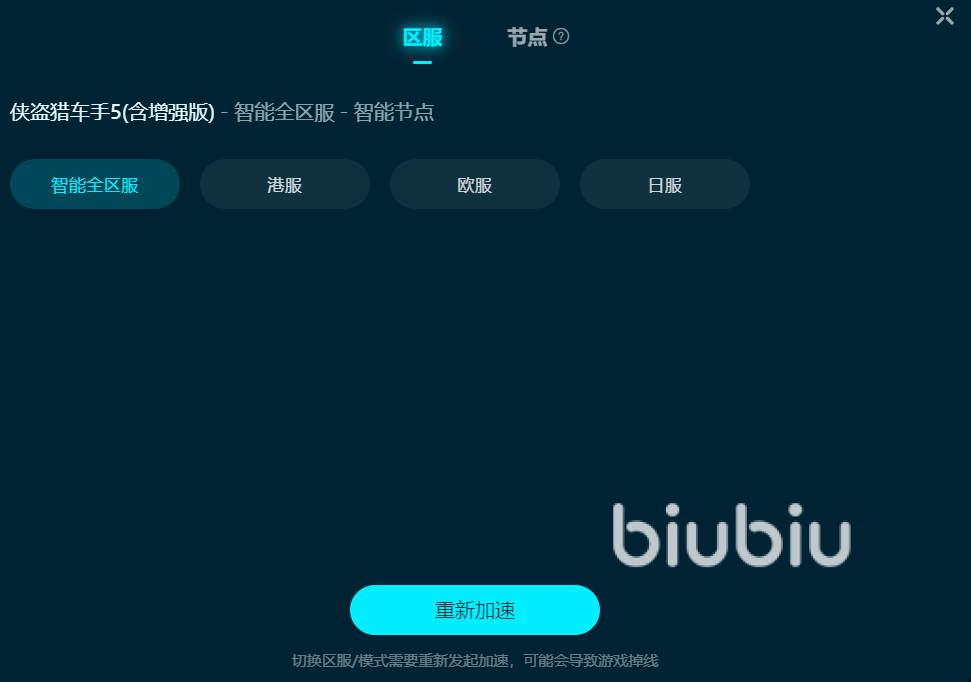 值得一提的是,biubiu对《GTA5》的支持堪称全方位:智能覆盖全区服、港服、欧服、日服等各大区服,针对不同服务器特性深度优化加速策略,玩家可随时暂停加速并自由切换区服。加速国际服效果尤为显著,即便跨洋连接也能有效抵御网络波动,连接又稳又快。