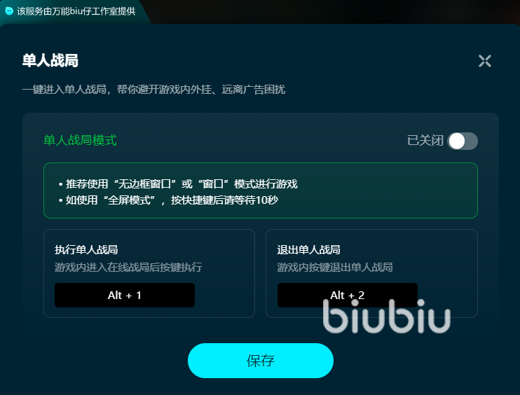 此外,biubiu还支持一键开启GTA5单人战局模式——点击加速界面的“单人战局”按钮,即可快速避开外挂、无广告干扰的纯净游戏环境,推荐搭配“无边框窗口”或“窗口”模式使用,若采用“全屏模式”,按快捷键后等待10秒即可自动切换,尽享清净自在的洛圣都之旅。