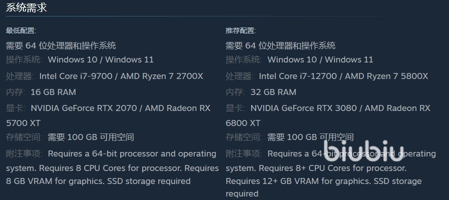 相比之下,推荐配置处理器AMD Ryzen 7 5800X,内存32GB RAM,让开放世界无缝切换,避免加载停顿。显卡英伟达 GeForce RTX 3080,在4K分辨率下提供丝滑体验,包括实时光追效果和精细纹理,硬性指标,100GB可用空间。