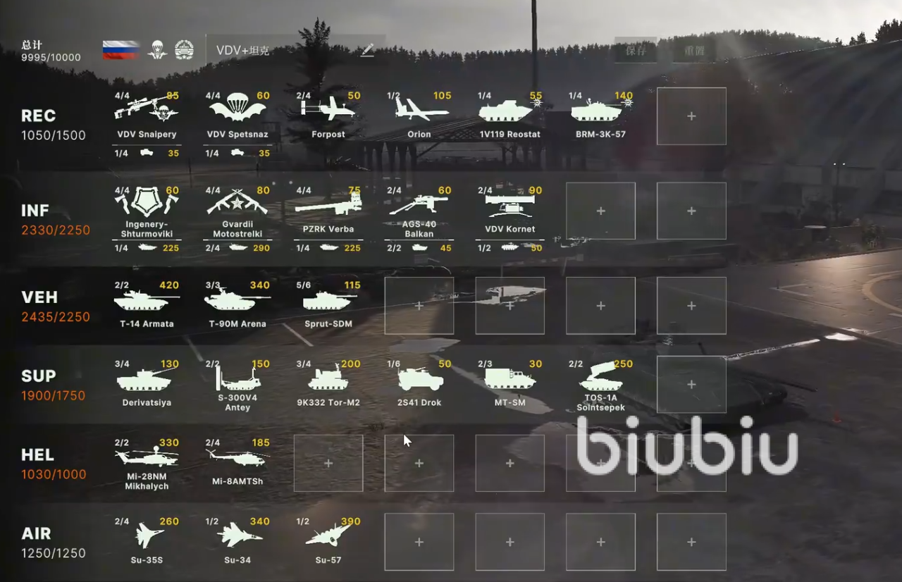 步兵海战术:VDV空降兵(RPG-28火箭筒)与榴弹班(AGS-30)绞杀敌方步兵;侦查单位渗透林地引导TOS-1A温压火箭弹覆盖据点。