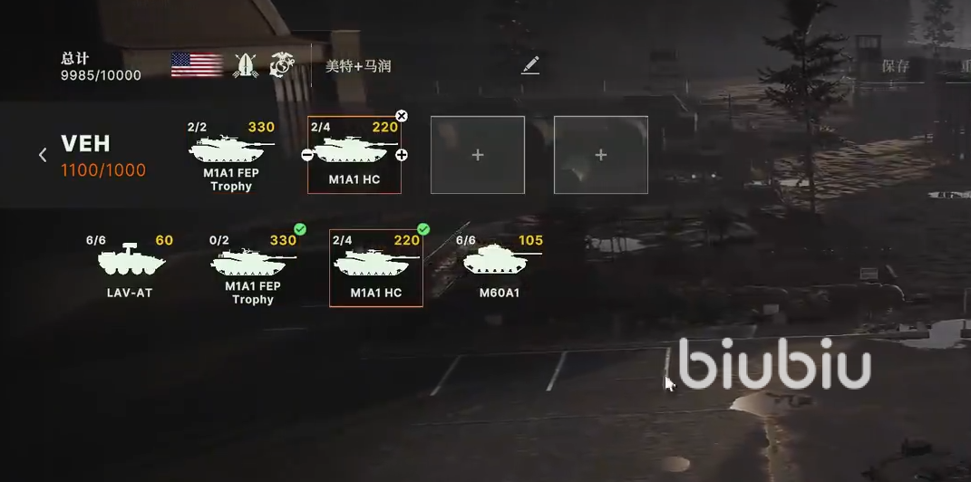 地面配置:陆战队CAAT班携带标枪导弹(攻顶)与Mk19榴弹发射器,配合ACV两栖运兵车(30毫米机炮)争夺建筑据点;M1A1 FEP坦克(四发APS)提供核心装甲支撑。