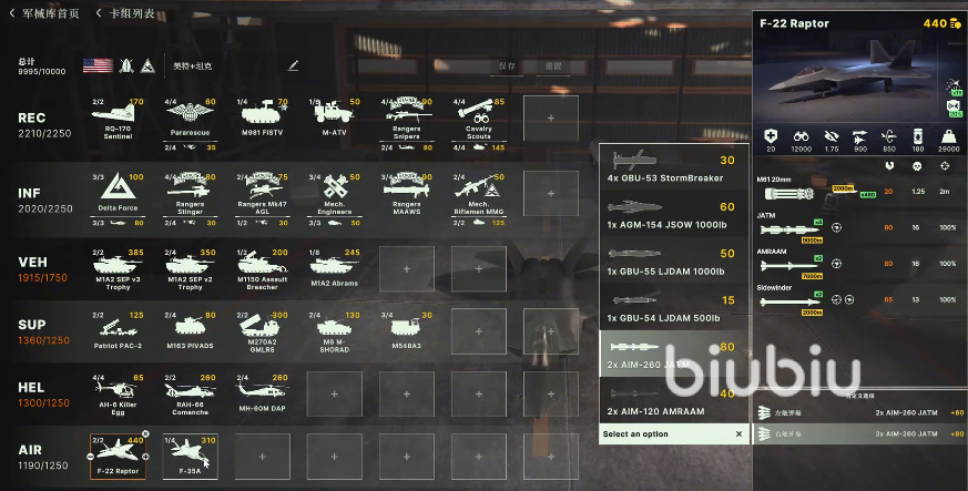 空军协同:F-22(带R-37远程空空弹)利用1.75隐蔽值先手击杀敌机,F-35B反辐射机压制敌方防空节点,为地面部队创造窗口。