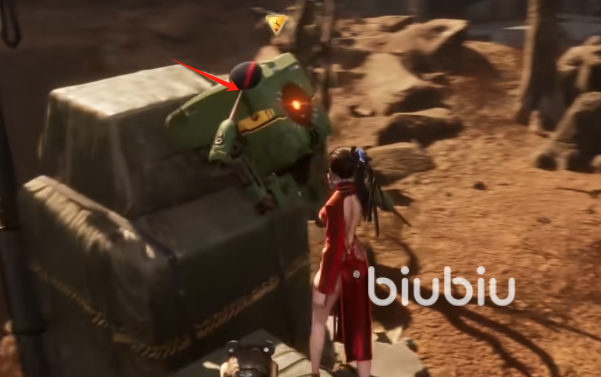 这次剧情是双向的,红莲跟伏特坐电梯来到了亚空间,也就是剑星的世界,伊芙被妮姬们判定为人类。双方会面之后,垃圾清理机器人罗姆发现了清扫机器人,一起过去查看。伊芙在废土区域开启自己的搜寻,找到下图中绿色小机器人进入调查环节。