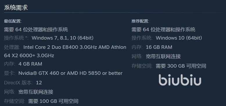 最低配置要求如下:操作系统须为Win7/8/10,处理器Intel Core 2 Duo E8400 3.0GHz,4GB存储,显卡要求为Nvidia® GTX 460 or AMD HD 5850 or better,100GB的可用存储空间。