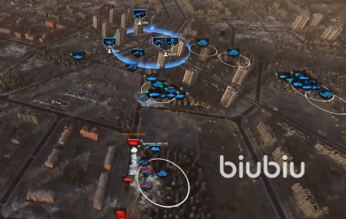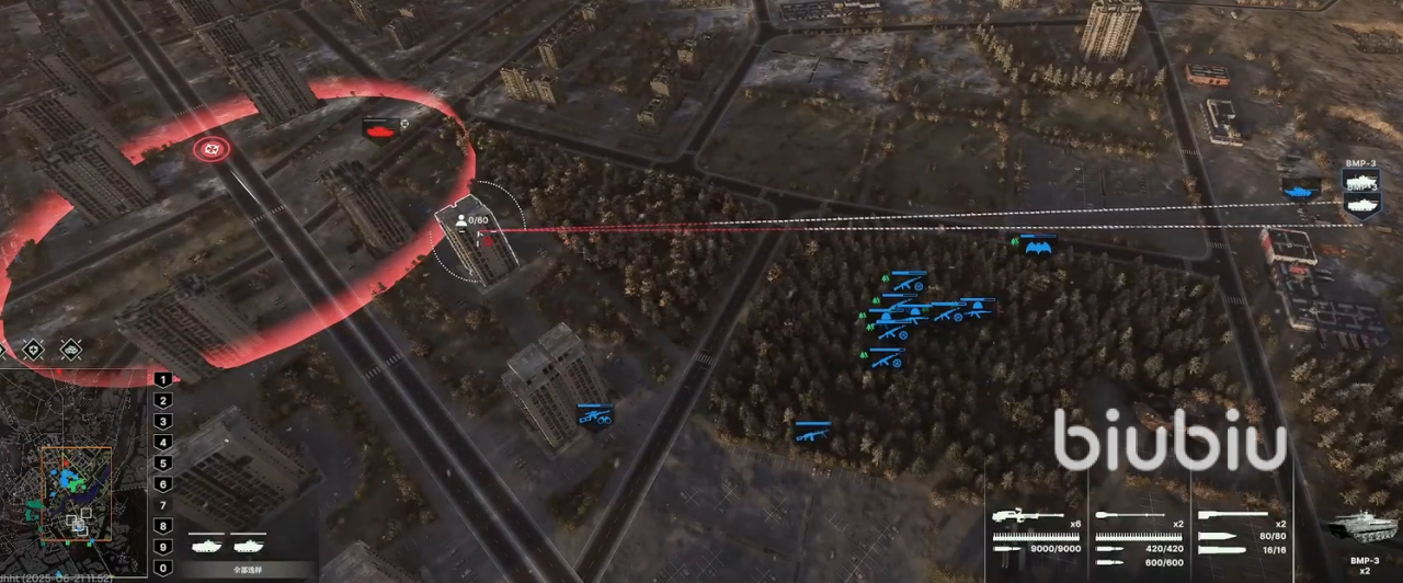 肃清市中心敌军时,步兵需依托建筑逐点清理。重装甲单位开火后立即封烟并转移位置,规避敌反坦克导弹锁定。特种部队在此阶段至关重要,将其部署至图中标枪火力组侧翼树丛。