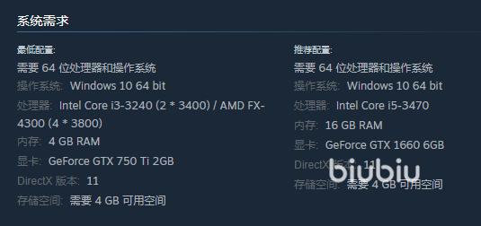 目前steam商店提供了这款游戏的两种配置,分别是最低和推荐,都要求64位处理器和操作系统,大家在对照的时候按照最低条件去查看即可,能达到就行,自己设备的品质越高越好。