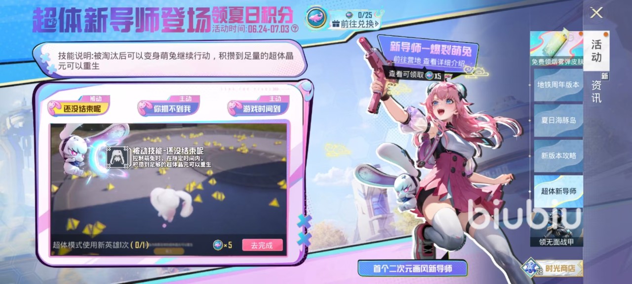 超体对抗增加了新的角色爆裂萌兔,拥有人和兔的两种不同形态,被淘汰之后是可以变成萌兔继续行动的。技能以快速位移为主,终极技能可以召唤萌兔一起作战。