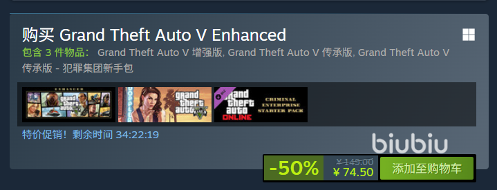 依据今年Steam夏促信息,此次活动价格为74.5元,包含增强版、传承版和传承版—犯罪集团新手包,降幅为50%,感兴趣的伙伴可前往购买。