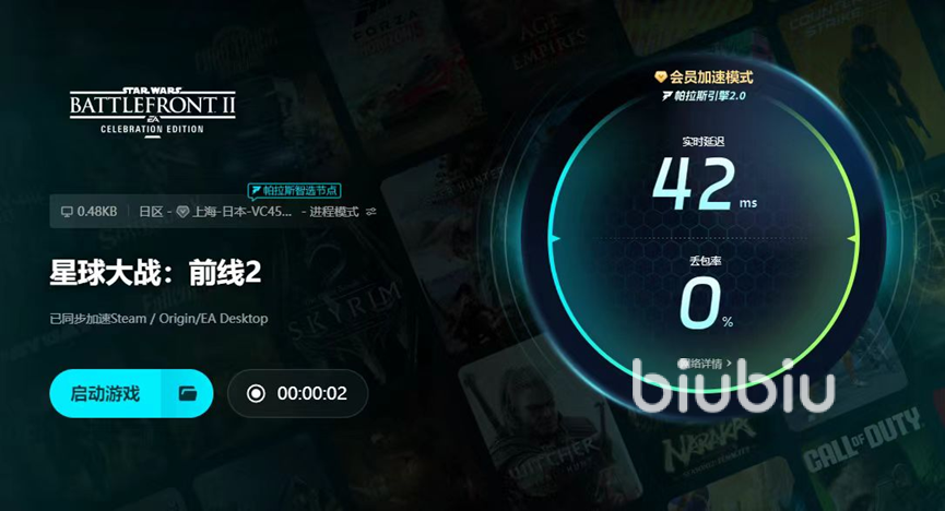新用户注册biubiu加速器,即可享受免费加速24小时的福利,无需花费一分钱,就能立刻体验高速下载的畅快。若你还想获取更长时间的免费加速,只需在biubiu加速器客户端内输入兑换码【biubiu不卡顿】,就能免费加速3天,让你有充裕的时间将《星球大战前线 2》完整、快速地下载到电脑中。使用时在biubiu加速器内搜索星球大战前线2,点击一键加速,随后在加速状态下启动游戏平台进行下载即可。