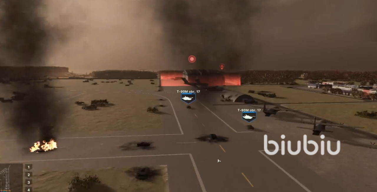 敌M1A2坦克集群从西北公路来袭时:BMP-3步战车用30mm机炮压制伴随步兵,T-90M发射3BM60穿甲弹(快捷键1)攻击坦克炮塔座圈弱点。