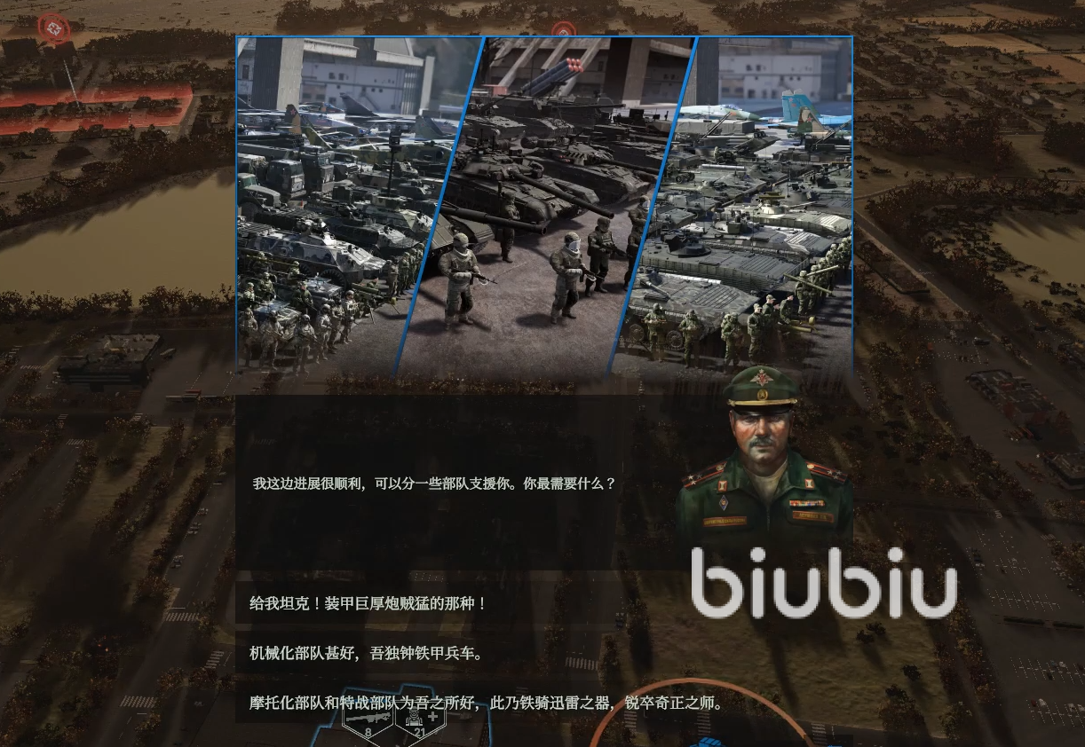 这里选择了坦克支援,获3辆T-14"阿玛塔",优势是主动防御系统拦截导弹。这里选完后注意地面部队位置,马上敌军会开始轰炸,地面部队留驻下图圈内。