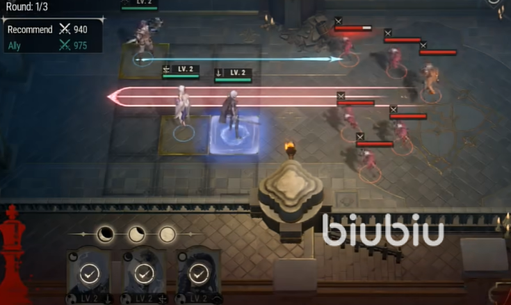 PVE闯关通常分成2-3个回合,玩家在每个回合开始前可优化阵容,最多进行3次行动,如上阵新角色或为已上阵角色升星并强化技能。BOSS战单回合给予玩家9次行动机会,玩家需通过合理布阵与升星来应对。