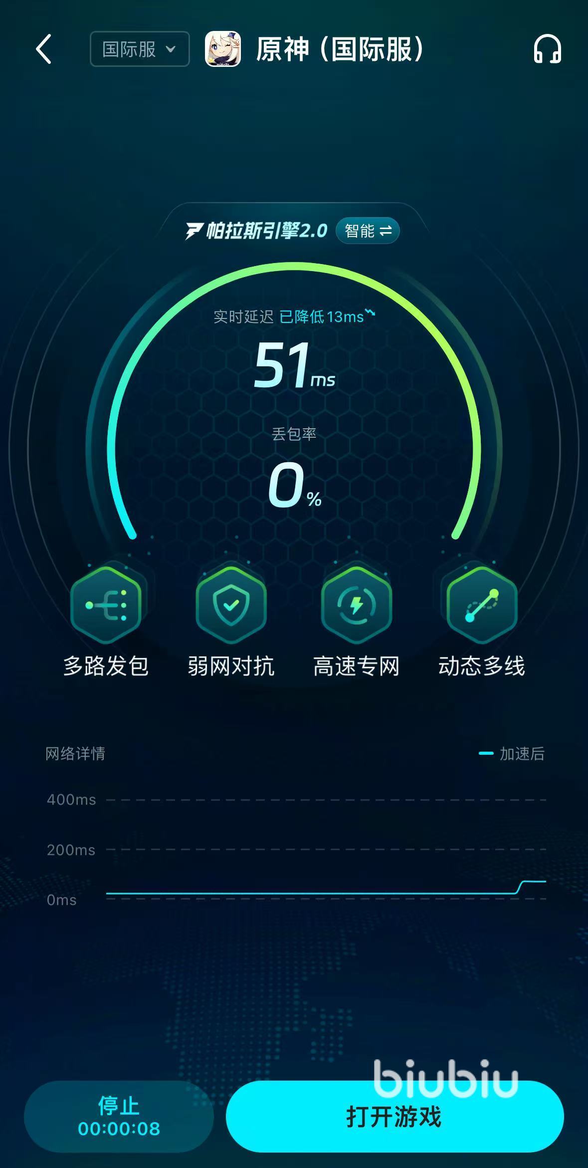 用户在操作方面也无需担心繁琐流程。biubiu加速器采用了极简设计理念,只需下载安装后,选择“原神国际服”并点击一键加速,即可自动完成所有优化设置,无需手动配置服务器、端口或其他技术选项。对于不具备复杂网络知识的玩家来说,这种“傻瓜式”操作极大降低了使用门槛。同时,biubiu还会实时显示当前的延迟、传输速率与加速效果,让玩家清楚了解网络状态与下载效率的提升情况,做到“看得见的加速”,更加安心与放心。